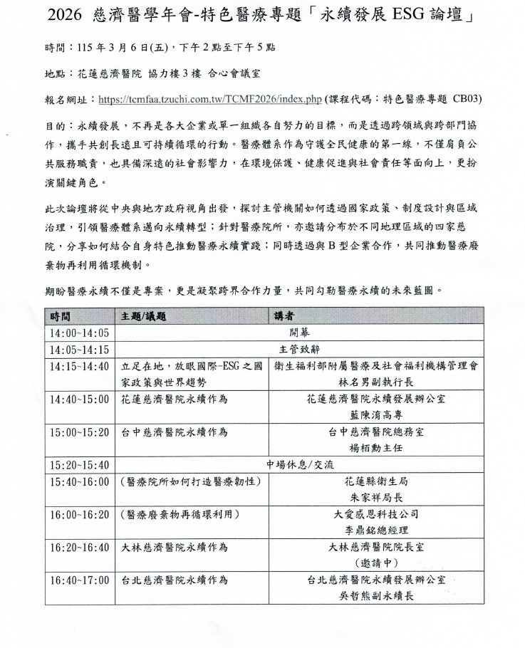 【活動公告】2026 TCMF 慈濟醫學年會暨永續發展 ESG 論壇
